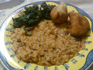 Serve-se logo que o arroz esteja cozido e com os espinafres a acompanhar temperados com sal e regados com azeite.