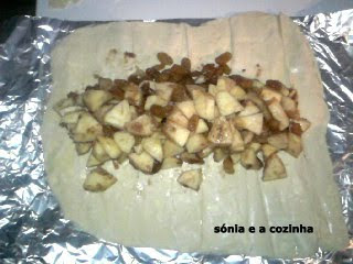 Misturar as maçãs com o açúcar, a canela e as passas escorridas e colocar sobre a massa.