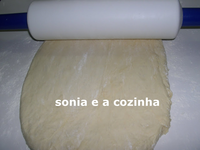 Dobrar o saco e espalmar com um rolo da massa. Aguardar no frigorífico.