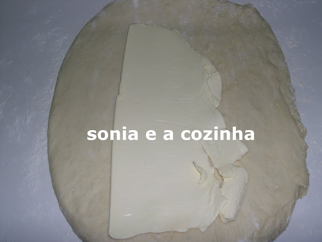 Esticar a massa sobre uma mesa polvilhada com farinha e colocar a margarina. Dobrar a massa e esticar novamente até ficar com espessura mínima de 1 cm.