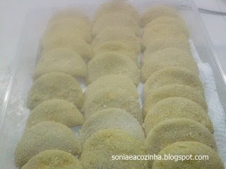 Passar por ovo batido e pão ralado. Congelar (para não abrirem) e fritar em óleo bem quente.