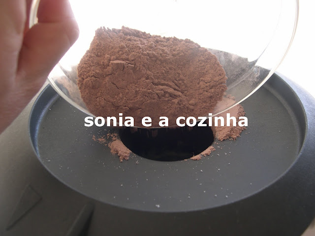 Bater as gemas com o açucar durante 3 minutos e velocidade 4. Juntar o óleo e a água com a máquina em movimento na velocidade 5 e com o copo medidor colocado. Bater durante mais 2 minutos na velocidade 5. Adicionar o chocolate em pó, a farinha com o fermento e bater durante 30 segundos na velocidade 4.